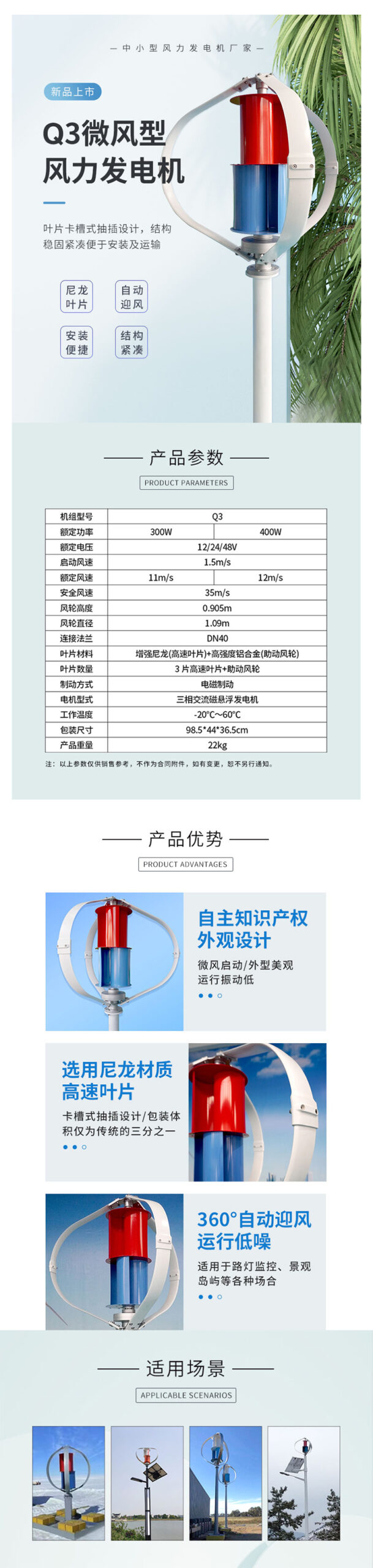 垂直轴风力发电机,功率区间:300W-400W